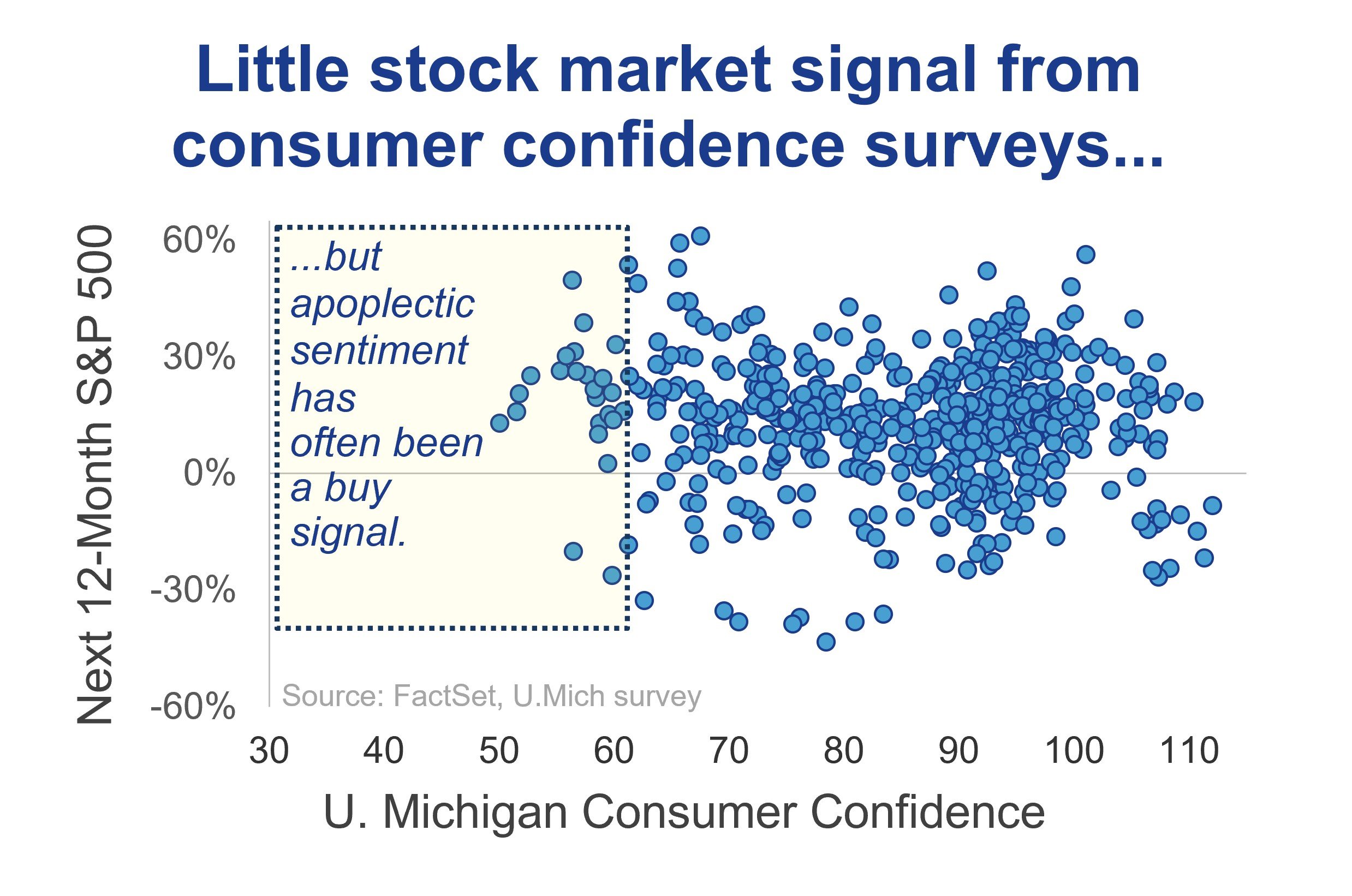 Last week, the University of Michigan’s widely followed survey reported a monthly reading of 55.4, the sixth-worst reading in the last 45 years. This generated a raft of spooky headlines, but consumer confidence data has historically had little-to-no correlation with stock market performance (see the mostly random-looking dot placement in the chart). But many of the worst months for this reading (at the left end of the chart) were great times to invest, including the early 1980s, early 2009, and mid-to-late 2022. Further, data out this week showed retail sales (i.e., consumer spending) accelerated at a pace above estimates. How people feel about the world is important, but it’s even more important to watch what they tend to do—and history suggests that sentiment surveys have been better for a juicy headline than for getting a market call right.