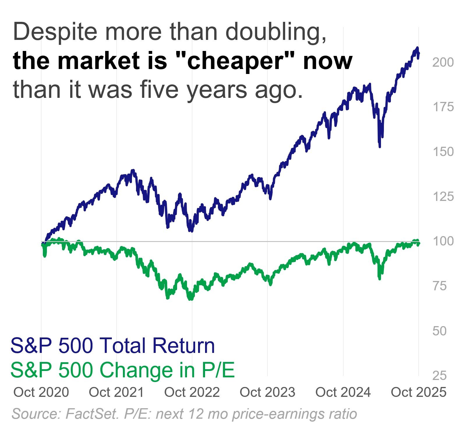 One measure of whether stocks are in a bubble is how much of the market’s rally is being driven by earnings growth vs. multiple growth. This is a way to gauge how much of a stock’s move is about excitement over future growth potential and how much is about the company’s fundamentals today. For example, if a stock price doubles but the company’s profits are flat, the price-to-earnings (P/E) multiple has doubled, making the shares more “expensive.” Over the last 5 years, the S&P 500 has more than doubled in price (+106%) but its P/E ratio has gone slightly down (because profits have increased). The S&P 500 Equal Weight index (referred to as “the average stock” because it removes the outsized influence of the largest companies) is up 83% over the same period but its forward P/E ratio has shrunk. For both versions of the index, stocks have gone up without getting more “expensive,” suggesting that prices could have a way to go before the market reaches bubble levels of speculation.