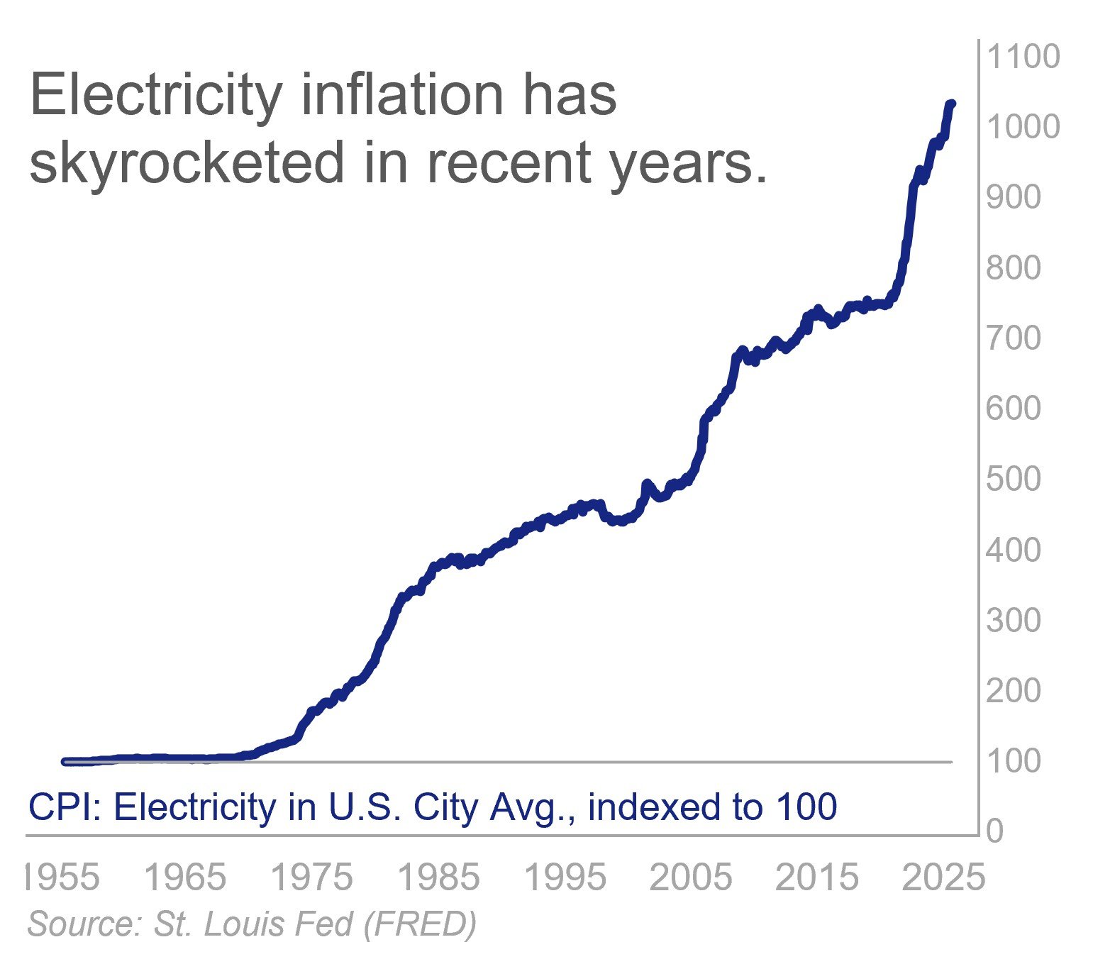 A colleague recently noted that despite Big Tech hype and a still-elevated interest rate environment, the best-performing sector in 2025 has been Utilities. This is due to the massive—and ever rising—power needs of the AI ecosystem. The IEA projects that electricity demand from data centers is set to more than double by 2030 to ~945 TWh, more than the entire annual electricity consumption of Japan today. The question is twofold: 1) is electricity generation a true bottleneck to AI reaching its potential; and 2) what is the fallout for the consumer if electricity prices continue to skyrocket? Electricity costs are up nearly 40% in the last five years, well above headline inflation and wage growth. Balancing the desire for AI leadership with consumer inflation worries will be a tightrope for governments to walk, and the question for the Utilities sector is whether higher electricity bills for customers will make it more difficult for utility firms to get rate increases and regulatory approval for investment plans.
